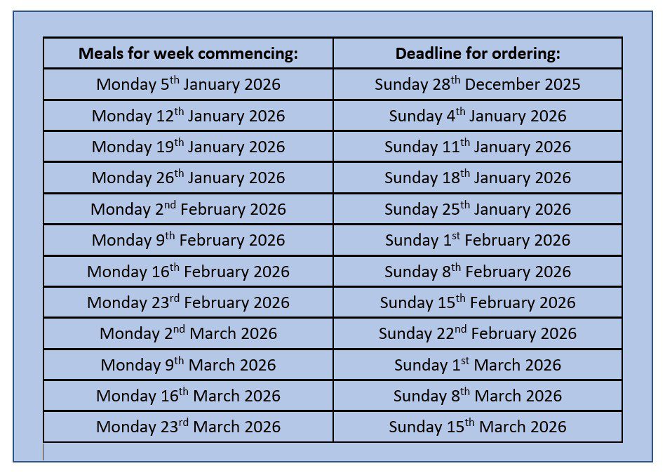 Meals are to be ordered one week in advance and can be ordered week by week or for the whole half term.